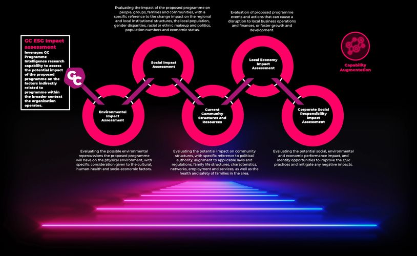 In addition to the Programme prioritization assessment as part of the Programme Business case development, we leverage GC Programme Intelligence research capability to assess the potential impact of the proposed programme on the factors indirectly related to programme within the broader context the organization operates. Leveraging proprietary GC programme contextual impact assessment tools, a comprehensive ESG assessment is conducted, taking the following contextual factors into consideration: