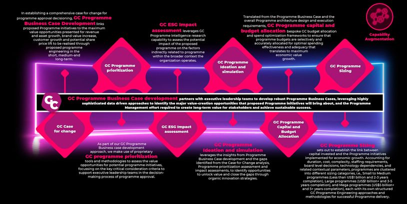 In establishing a comprehensive case for change for programme approval decisioning, GC Programme Business Case Development leverages GC Financial Engineering and Programme Intelligence capability to conduct Macro, Micro and Enterprise economic performance analysis to develop compelling justifications for potential Programme initiatives to be implemented. Based on our insights and findings, we link proposed Programme initiatives to the maximum value opportunities presented for revenue and asset growth, brand value increase, customer growth and potential Share Price lift to be realised through proposed programme engineering in the short, medium- and long-term.