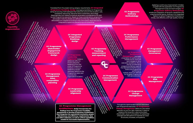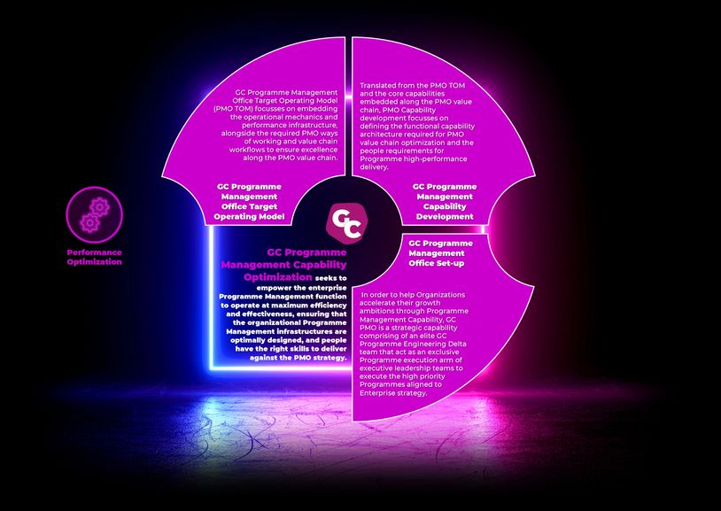 In order to help Organizations accelerate their growth ambitions through Programme Management Capability, GC PMO is a strategic capability comprising of an elite GC Programme Engineering Delta team that act as an exclusive Programme execution arm of executive leadership teams to execute the high priority Programmes aligned to Enterprise strategy. As part of the GC PMO set-up, we set out to leverage high priority programmes for internal capability building, developing capability infrastructure for future sustainability. In order to achieve this, GC Business Transformation Capability is leveraged for PMO set-up, defining the functional capability architecture aligned to the core value generating elements of the business, with a Programme Management infrastructure embedded to enhance the organization's ability to execute on Strategic Programme initiatives and maximize capturing the value opportunities identified.