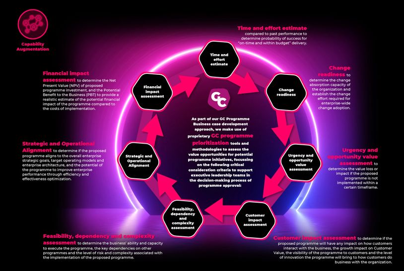 As part of our GC Programme Business case development approach, we make use of proprietary GC programme prioritization tools and methodologies to assess the value opportunities for potential programme initiatives, focussing on the following critical consideration criteria to support executive leadership teams in the decision-making process of programme approval: