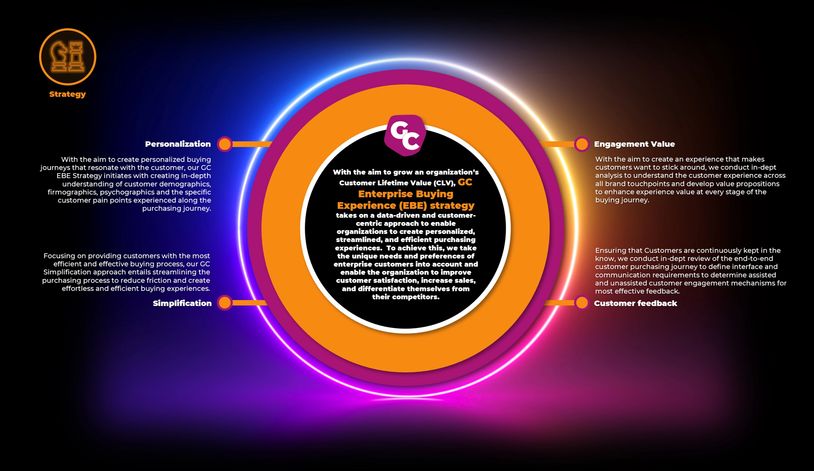 With the aim to grow an organization’s CLV, GC Enterprise Buying Experience (EBE) Strategy takes on a data-driven and customer-centric approach to enable organizations to create personalized, streamlined, and efficient purchasing experiences. To achieve this, we take the unique needs and preferences of enterprise customers into account and enable the organization to improve customer satisfaction, increase sales, and differentiate themselves from their competitors. Our GC EBE Strategy focusses on the following key levers that aim to optimize the customer centric buying journey: