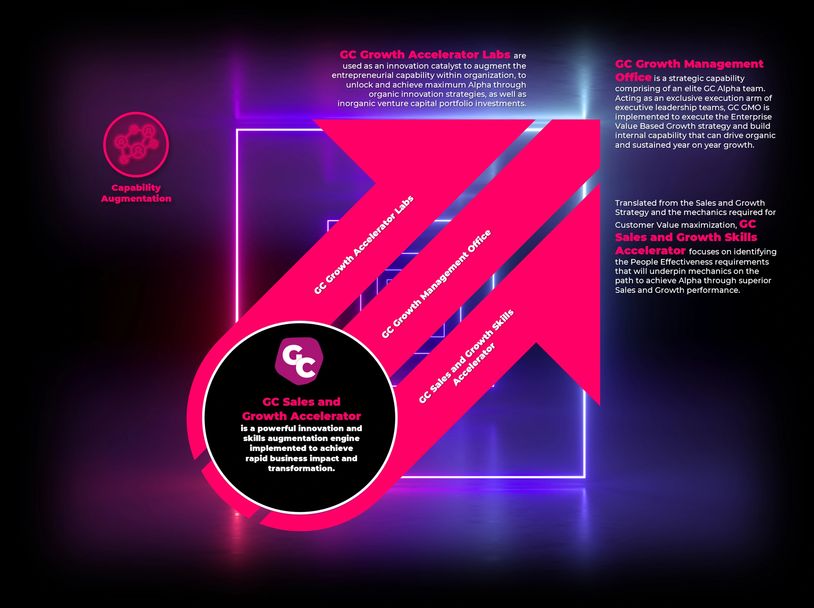 GC Sales and Growth Accelerator is a powerful innovation and skills augmentation engine that is implemented to achieve rapid business impact and transformation. Through our GC Growth Accelerator Labs, we partner with organizations to unlock and achieve maximum Alpha through organic innovation strategies, as well as inorganic venture capital portfolio investments. Through our highly sophisticated GC Growth Accelerator Labs methodologies, we identify high-potential growth initiatives and fast-track new growth ventures development to optimise and channel venture capital allocation towards the path to profitability. In order to ensure the critical capabilities, skills and behaviours needed to enable accelerated sales and growth, our GC Sales and Growth Skills Accelerator programmes are deployed to enable rapid skills and behaviour transformation, and build robust confidence in functional capability to realize maximum value from people.
