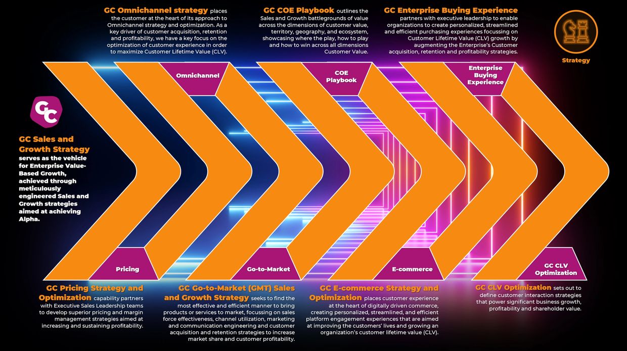 Aligned to our GC philosophy of Enterprise Value-Based Management (EVBM), GC Sales and Growth Strategy serves as the vehicle for Enterprise Value-Based Growth (EVBG), achieved through meticulously engineered Sales and Growth strategies aimed at achieving Alpha. As a key driver of Shareholder Value maximization, GC Sales and Growth Strategy takes on a comprehensive approach of augmenting an organization’s ability to generate sustainable economic value through increasing its Customer Value. Leveraging a blend of GC Financial Engineering, Sales and Growth intelligence, Marketing and Communication Engineering and Sales and Growth Alpha practices, our GC Sales and Growth Strategy approach is encapsulated in the GC CEO playbook, which outlines the Sales and Growth battlegrounds of value across the dimensions of Customer Value, territory, geography, and ecosystem, showcasing where to play, how to play and how to win across all dimensions Customer Value. Aligned to our GC philosophy of Enterprise Value creation, using our highly advanced GC proprietary growth simulation, hypo testing and Customer Value optimization modelling tools, the CEO playbook is a comprehensive Enterprise-wide Sales and Growth strategy blueprint that combines the Enterprise Performance Optimization (EPO) strategies, with the EVBG engineering required to enhance Customer Value and ultimately Share Price in a predictable Manner.